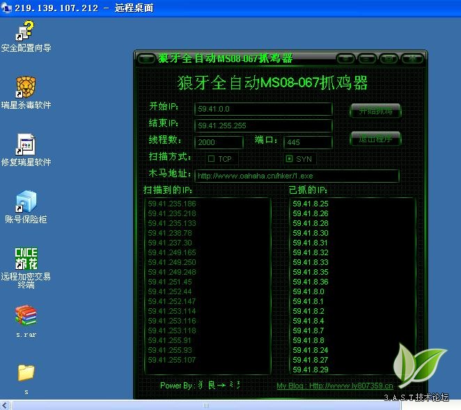 咳咳 。。。ms08067   我都是手动抓了不少 那时还没这手动抓机器 也没接触过、、、、不过lz扫的好多,,嘻嘻 我扫这样一个段 很多开445,但很少成功的   不过还是有   不过现在一扫。。。几乎全无了   5555:'(     综上所述 :这个已经跟不上社会的步伐啦。。。。